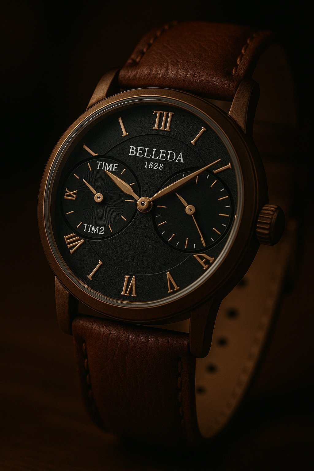 BELLEDA Dual-Time Analog Watch (Brown Leather Strap)* – A luxury-style men’s watch with a tan leather band and a large round face featuring two separate analog time displays labeled “TIME1” and “TIME2.” It’s powered by quartz movement and marked “BELLEDA 1828” on the dial. The watch combines rose-gold and black accents for a modern look. Price: Rs. 3,680 (approx). SKU: BEL-9257. Dimensions: (44mm); Weight: (0.2kg).